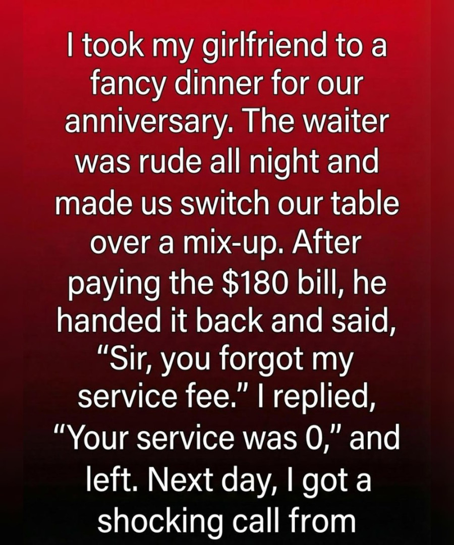 I told myself it wasn’t worth dwelling on. No night is flawless. Still, each brief interaction with the waiter chipped away at the joy—an exaggerated sigh, a dismissive look, a tone that made us feel like an inconvenience. My girlfriend noticed it too. She squeezed my hand beneath the table, a quiet reassurance that the night was still ours, that what mattered was being together.