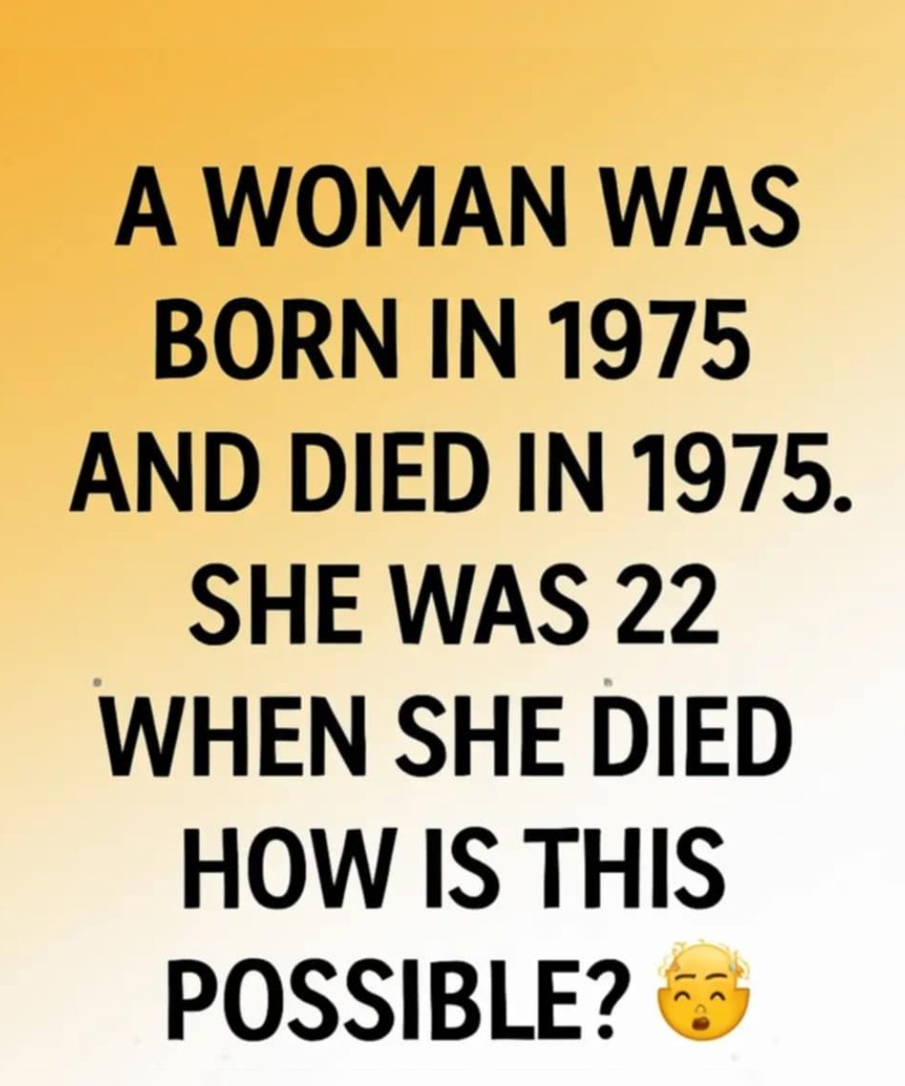 A puzzling riddle has gone viral online, drawing widespread attention and leaving countless users confused. The image presents a seemingly impossible scenario: “A woman was born in 1975 and died in 1975. She was 22 years old when she died. How can this be?” The statement quickly ignited discussion and speculation across social media.