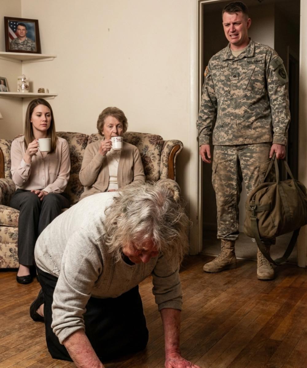 On the sofa behind me, my daughter-in-law Laura and her mother sat comfortably, legs crossed, cups of coffee in hand. They laughed softly, scrolling through their phones, occasionally lifting their feet just enough so I could wipe underneath them. To them, I wasn’t family. I was furniture. Something useful, silent, and easily ignored.