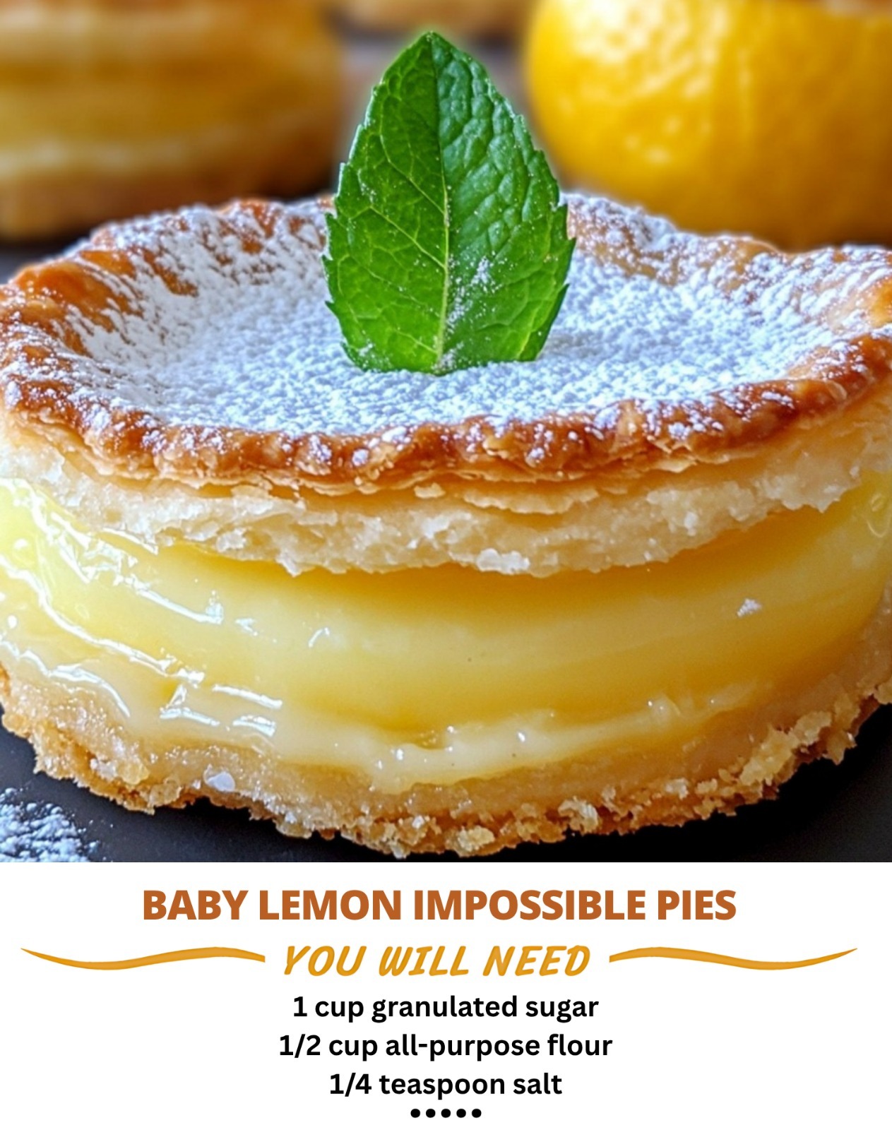 f you’re a fan of tangy, citrusy desserts but want something quick and fuss-free, these Baby Lemon Impossible Pies are here to delight your taste buds. These mini pies are made with a simple batter that magically separates into layers while baking, creating a soft, custard-like filling topped with a golden crust. Perfect for parties, potlucks, or simply satisfying a sweet craving, these bite-sized treats are as adorable as they are delicious. Let’s dive into how you can make this zesty, crowd-pleasing dessert at home!