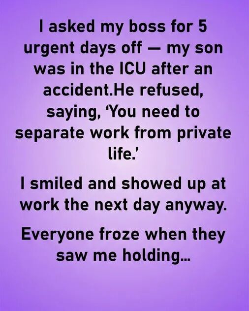 When my boss approached my desk, I didn’t tense or prepare a speech. I met his eyes and repeated his own words back to him, evenly, without accusation. I told him I would take care of what genuinely could not wait, and then I would return to my son at the hospital. There were no apologies tucked into my sentences, no explanations offered to soften the statement. I didn’t overtalk. I didn’t justify. I stated a boundary as plainly as one states the weather. This is how it will be.