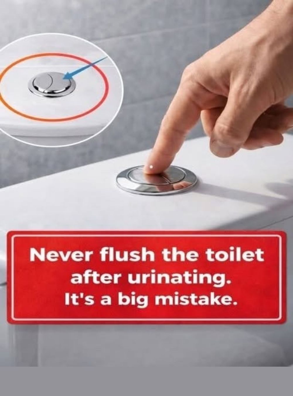 At first glance, the image feels almost shocking. A finger hovering over the flush button, paired with a bold warning: “Never flush the toilet after urinating. It’s a big mistake.” It sounds extreme, even unhygienic. And yet, messages like this keep circulating for a reason—they spark curiosity, debate, and reflection about habits we never question.