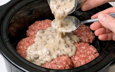 Pour cream of mushroom soup over raw burger patties, alongside 3 simple ingredients, into slow cooker for a budget-friendly dinner that disappears faster than anything else