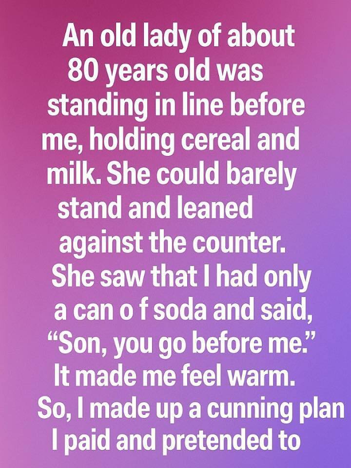 Her small act lingered in my mind as I considered what to do next. I devised a quiet plan, subtle enough to maintain her dignity while honoring the generosity she had shown me. I paid for my soda, then pretended to fumble with my wallet, patting my pockets as if I’d forgotten something essential. I stepped aside but didn’t leave, lingering near the counter in a way that made it look unintentional. From the corner of my eye, I watched her carefully. Her hands trembled slightly as she adjusted the cereal box, the deliberate motions of someone navigating daily life with practiced patience. Her smile wasn’t forced—it radiated from a place that knew the value of simple, unassuming kindness. It was a reminder that generosity rarely announces itself; it simply exists.